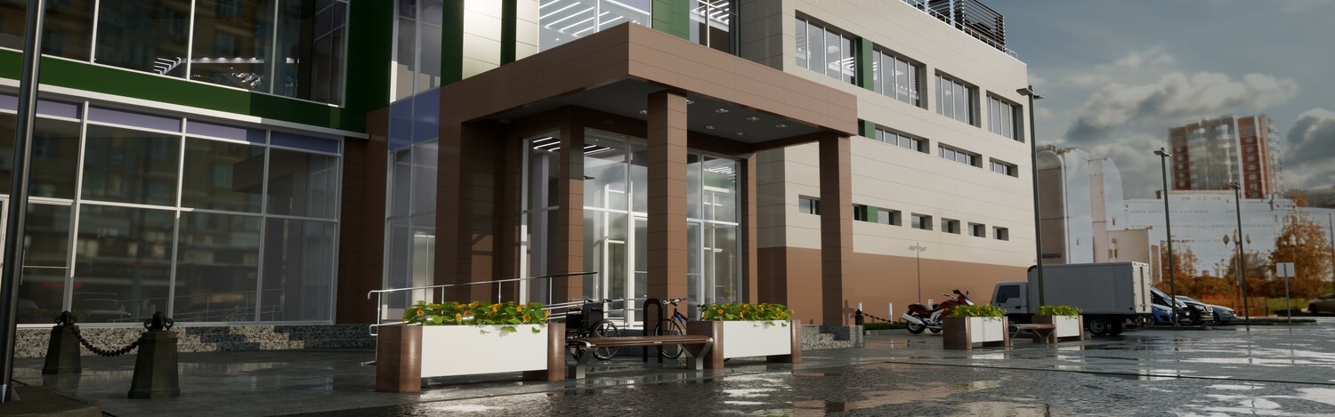 Проект реконструкции и переоборудования заброшенного здания комбината бытовых услуг в офисно-административное здание с торговыми площадя- ми. Общая площадь 5000 м2. Проектирование и строительство 2020 год. В ходе подготовки проекта, основными задачами являлось выпуск рабочей документации на фасадные системы и остекление, размещение лифтового оборудования, интеграция инженерных систем здания в дизайн помещений, контроль исполнения строительно монтажных работ.